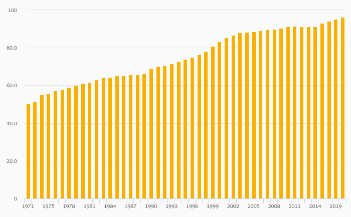 Girls to Boys In Primary and Secondary Education rose 0.596% to 95.7% in Laos in 2020