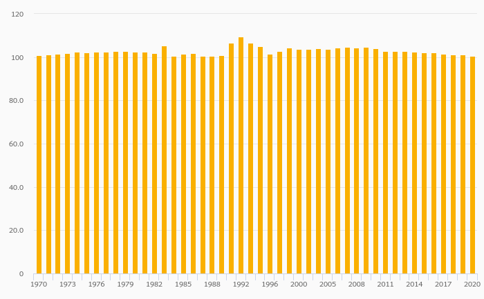 Girls to Boys In Primary and Secondary Education fell 1.25% to 101% in India in 2020