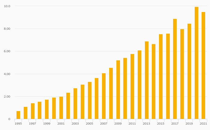 Households' Pension Fund Assets (USD) rose 16.1% to USD 7.66 bil in Latvia in 2021