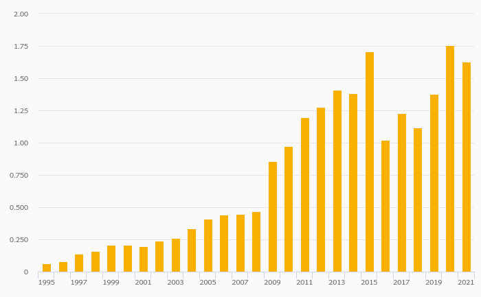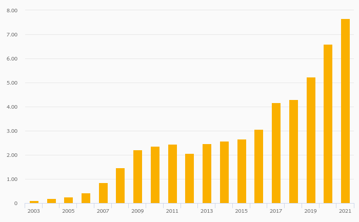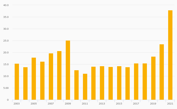 Households' Pension Fund Assets (USD) rose 34.5% to USD 7.45 bil in Lithuania in 2021