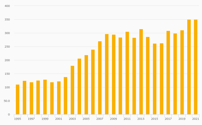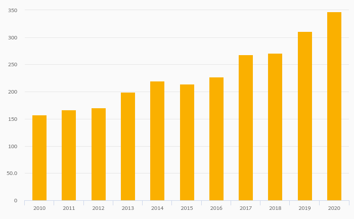 Households' Pension Fund Assets (USD) rose 11.8% to USD 348 bil in Israel in 2020