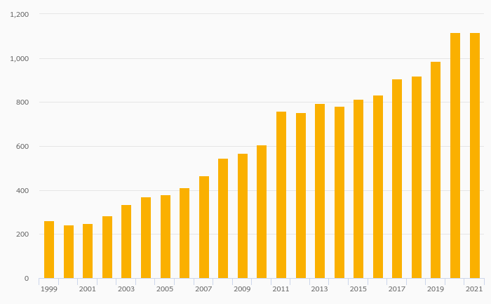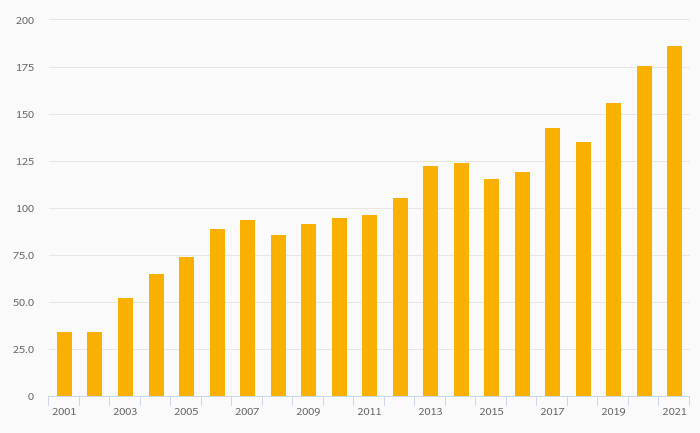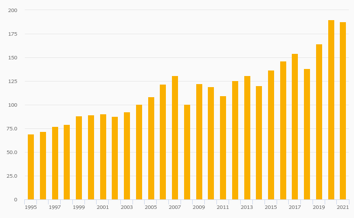 Households' Pension Fund Assets (USD) rose 6.03% to USD 187 bil in Ireland in 2021