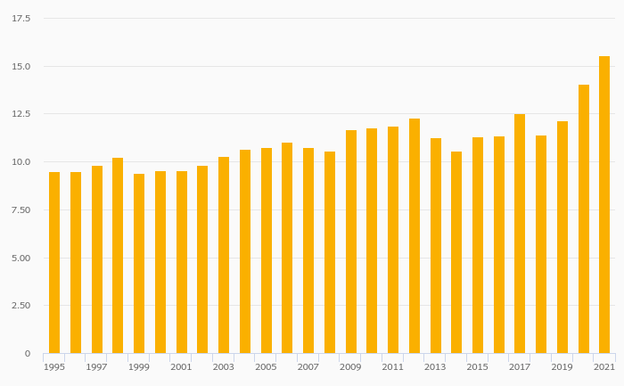 Households' Pension Fund Assets (As % of GDP) rose 10.7% to 15.6% in Austria in 2021