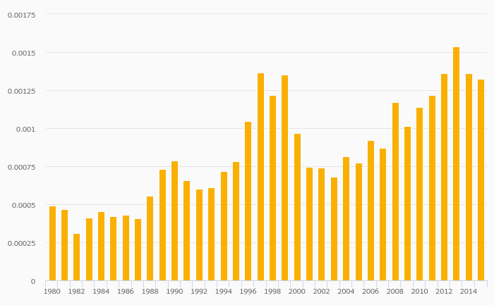 Coal Consumption (As % of Worldwide Consumption) fell 2.77% to 0.001% in Chile in 2015