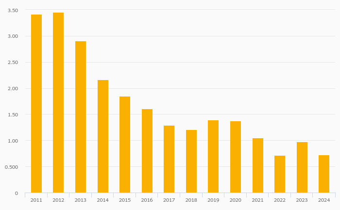 Non-Performing Loans (As % of Total Loans) fell 25.8% to 0.721% in Israel in 2024