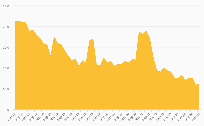 Non-Performing Loans (As % of Total Loans) fell 12.5% yoy to 6.19% in Maldives in 1Q2025