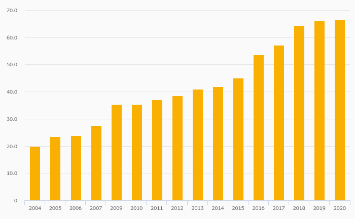 Gross School Enrollment, Female (Tertiary Education) rose 7.49% to 63.9% in China in 2020