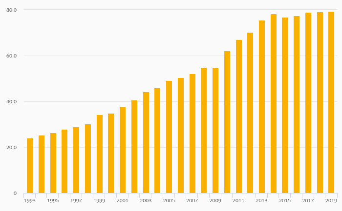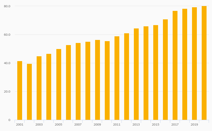 Gross School Enrollment, Female (Tertiary Education) rose 0.833% to 79.9% in Serbia in 2020