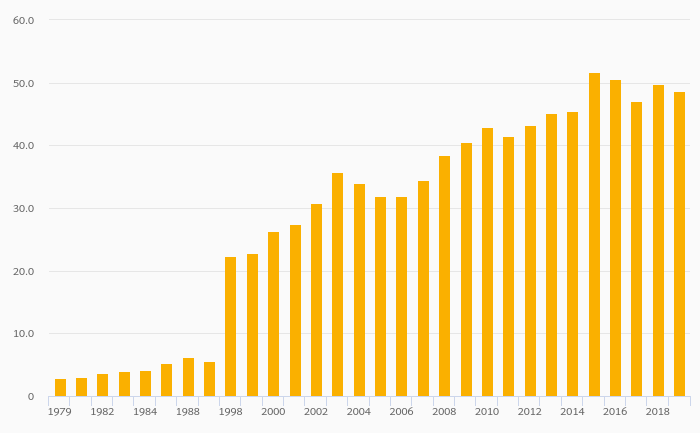 Gross School Enrollment, Female (Tertiary Education) fell 2.23% to 48.7% in Malaysia in 2019