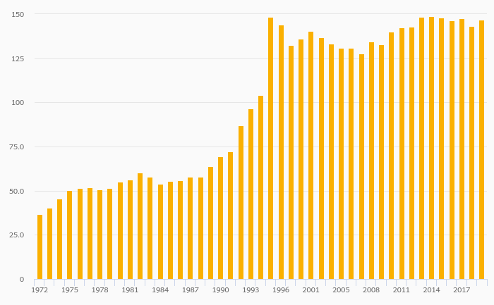 Gross School Enrollment, Female (Primary Education) rose 2.70% to 147% in Malawi in 2019