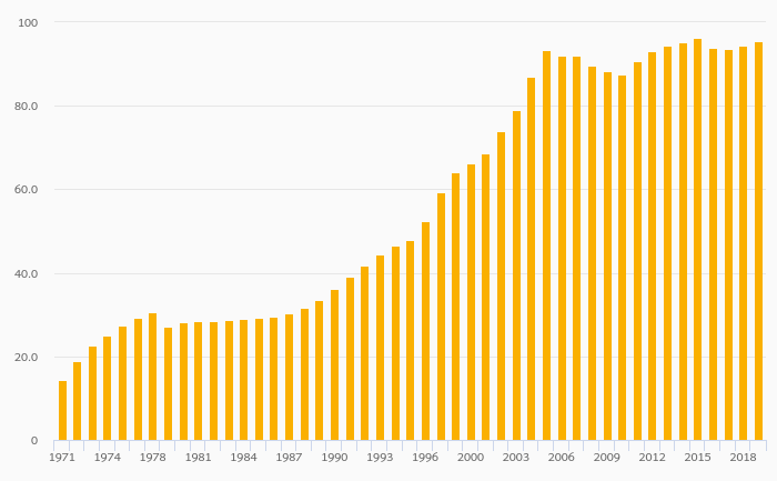 Gross School Enrollment, Female (Tertiary Education) rose 1.14% to 95.5% in Denmark in 2019