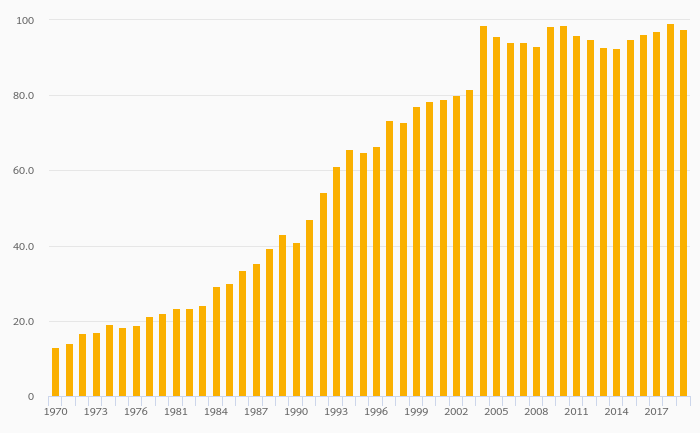 Gross School Enrollment, Female (Tertiary Education) fell 1.59% to 97.6% in New Zealand in 2019