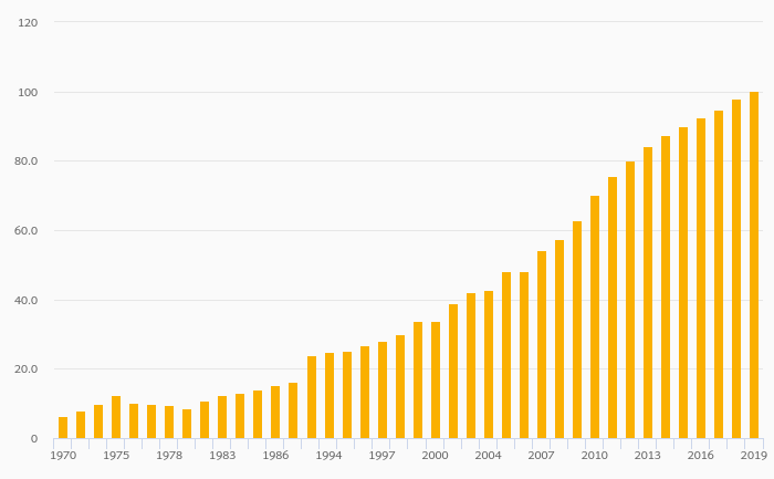 Gross School Enrollment, Female (Tertiary Education) rose 2.52% to 100% in Chile in 2019