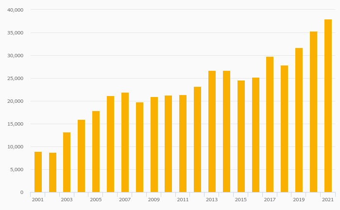 Households' Pension Fund Assets Per Capita (USD) rose 7.64% to USD 38,030 in Ireland in 2021