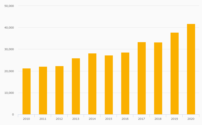 Households' Pension Fund Assets Per Capita (USD) rose 10.5% to USD 41,733 in Israel in 2020