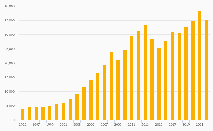 Households' Pension Fund Assets Per Capita (USD) fell 8.41% to USD 35,075 in Norway in 2022