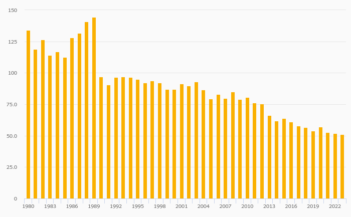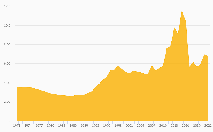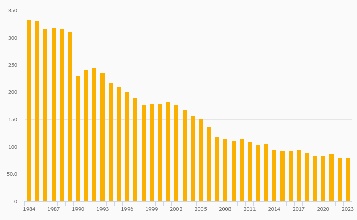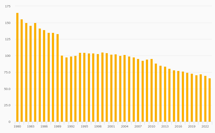 Energy Use (kg of Oil Equivalent) Per USD 1,000 of GDP fell 4.91% to 66.3 kg in Japan in 2023
