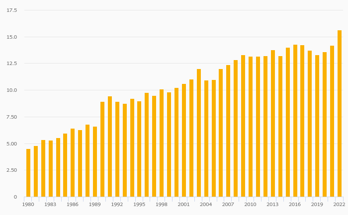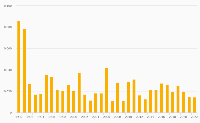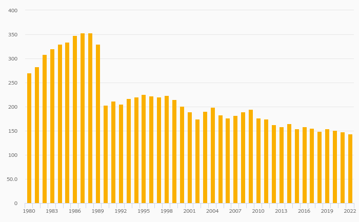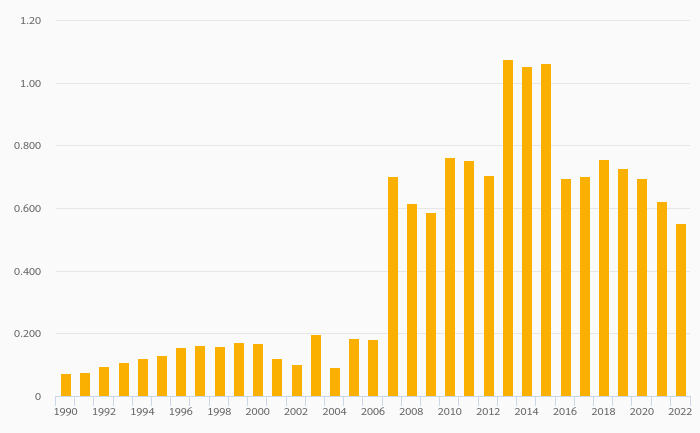 Energy Use (kg of Oil Equivalent) Per USD 1,000 of GDP (Constatnt 2011 PPP) fell 2.57% to 89.6 kg in the World in 2022