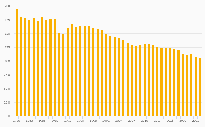 Energy Use (kg of Oil Equivalent) Per USD 1,000 of GDP fell 2.40% to 106 kg in South Korea in 2023