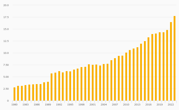 GDP Per Unit of Energy Use (PPP $ Per kg of Oil Equivalent) rose 7.74% to USD 17.7 in Mexico in 2023