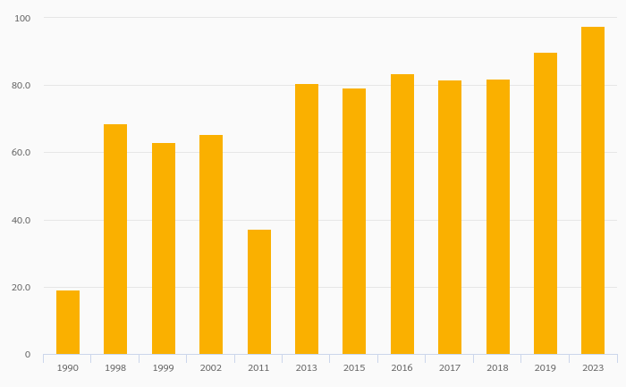 Female to Male Tertiary Enrollment Rate rose 0% to 97.6% in Angola in 2023