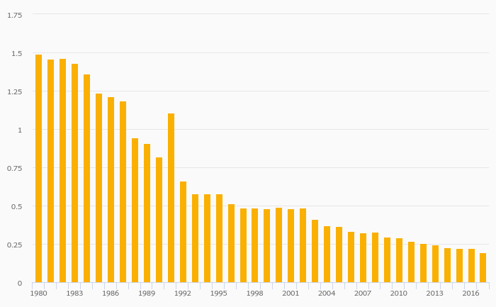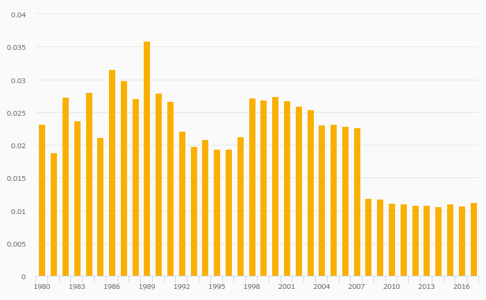 Crude Oil Reserves (As % of Worldwide Reserves) fell 12.5% to 0.196% in Indonesia in 2017