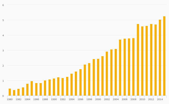 Dry Natural Gas Production (As % of Worldwide Production) rose 4.38% to 5.26% in Iran in 2015