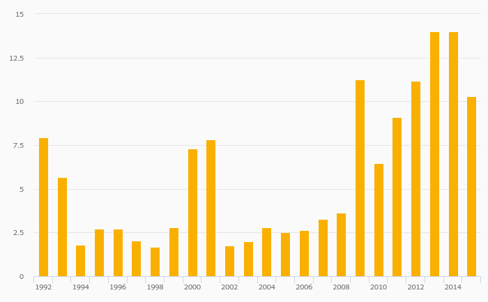 Distillate Fuel Oil Consumption fell 26.6% to 10.3 '000 bpd in Kyrgyzstan in 2015