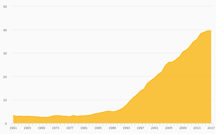 Fruit Consumption Per Capita rose 0.141% to 39.5 kg in China in 2017