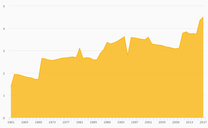 Fruit Consumption Per Capita rose 3.55% to 4.51 kg in Central African Republic in 2017