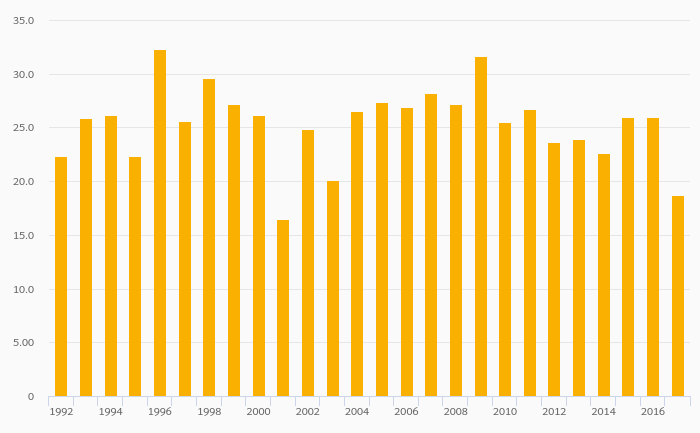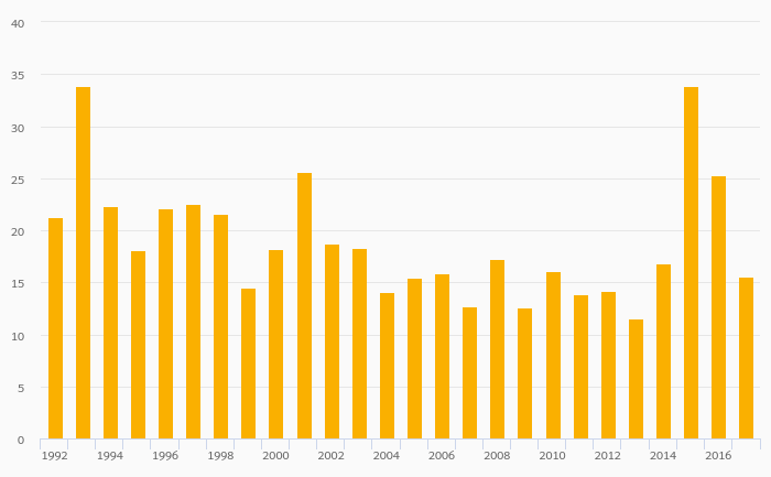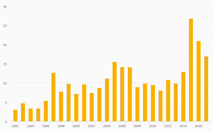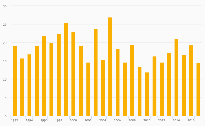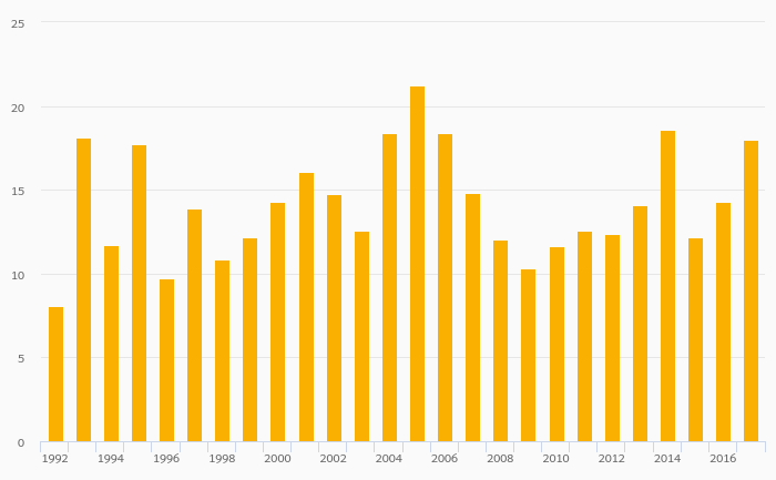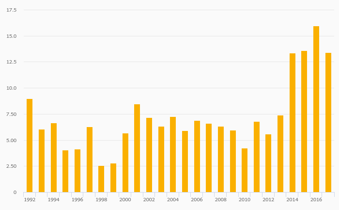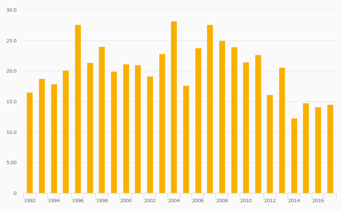 Fruit Consumption Per Capita rose 26.1% to 18.0 kg in Latvia in 2017