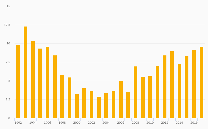 Fruit Consumption Per Capita rose 5.35% to 9.53 kg in Tajikistan in 2017