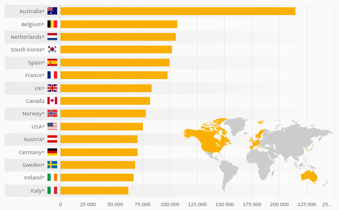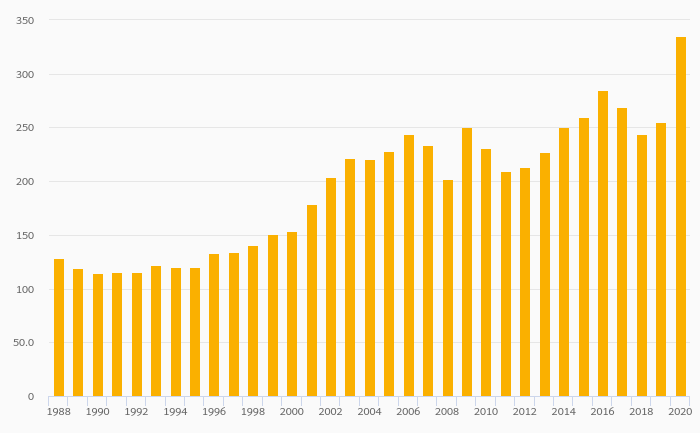 Households' Land Assets (As % of GDP) rose 31.5% to 336% in Australia in 2020