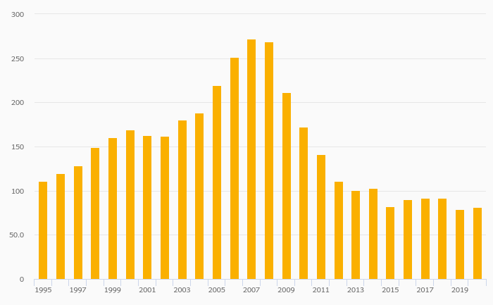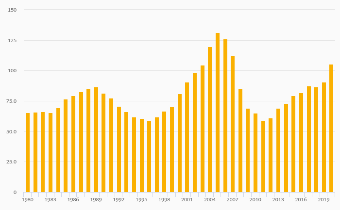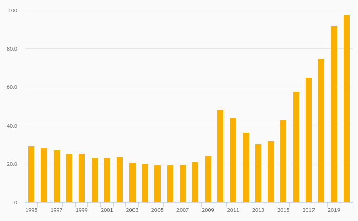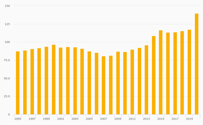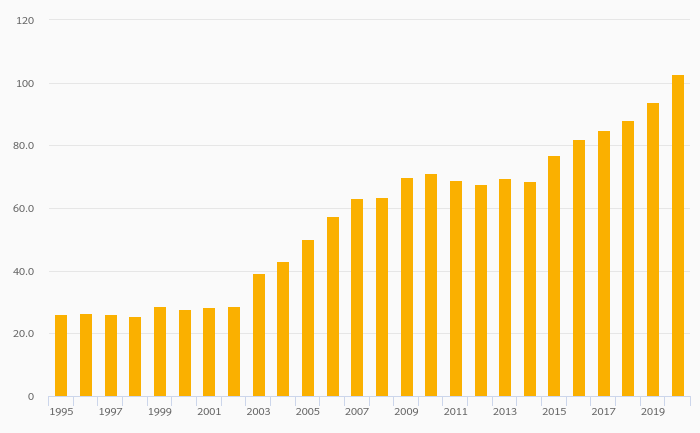 Households' Land Assets (As % of GDP) rose 9.42% to 103% in Sweden in 2020