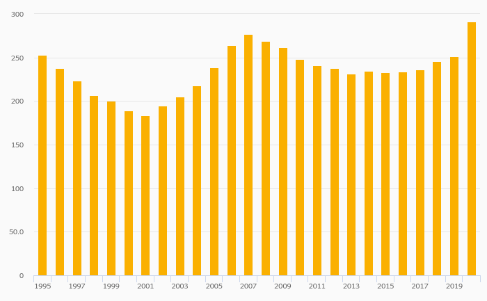 Households' Land Assets (As % of GDP) rose 16.0% to 291% in South Korea in 2020
