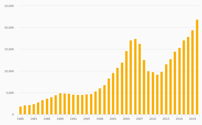 Households' Assets In Land (USD) rose 13.0% to USD 21,903 bil in the USA in 2020