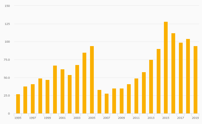 International Tourism, Expenditure (USD) fell 9.62% to USD 94.0 mil in Suriname in 2019