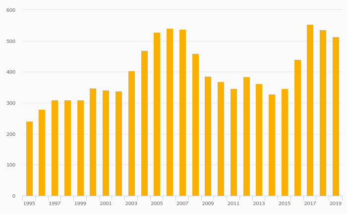 International Tourism, Expenditure (USD) fell 4.10% to USD 514 mil in Bahamas in 2019