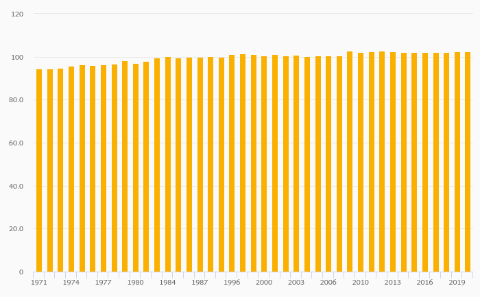 Girls to Boys In Primary and Secondary Education fell 0.103% to 102% in Ecuador in 2020