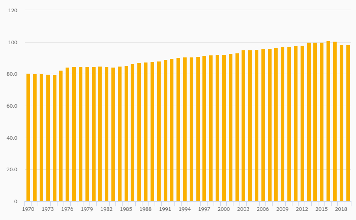 Female to Male Primary Enrollment Rate rose 0.360% to 98.2% in Guatemala in 2020