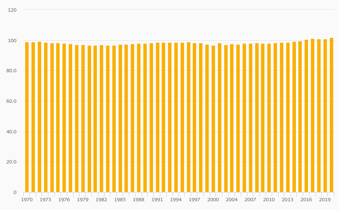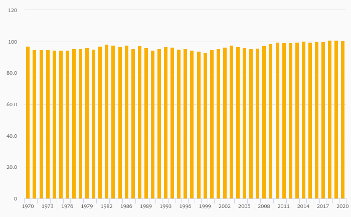 Girls to Boys In Primary and Secondary Education fell 1.25% to 101% in India in 2020