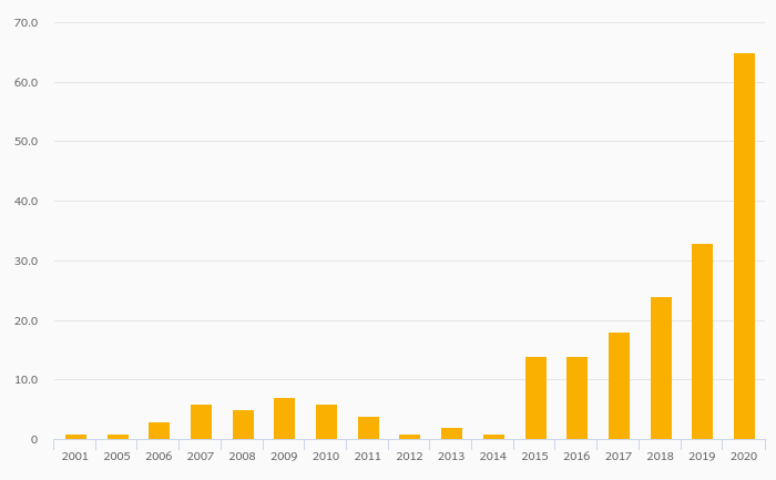 Secure Internet Servers rose 97.0% to 65.0 in Mauritania in 2020