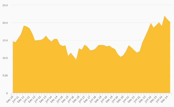 Bank Pre-Tax Return on Equity (Pre-Tax ROE) rose 0.605% yoy to 20.1% in Belarus in 1Q2025