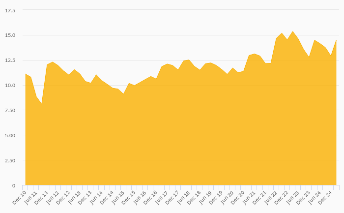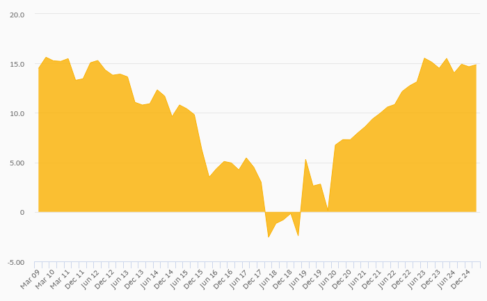 Bank Pre-Tax Return on Equity (Pre-Tax ROE) fell 4.17% yoy to 14.9% in India in 1Q2025