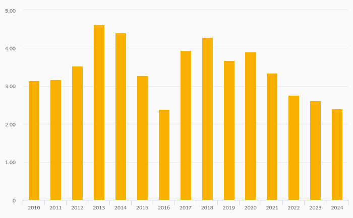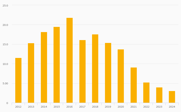 Non-Performing Loans (As % of Total Loans) fell 8.26% to 2.40% in Denmark in 2024