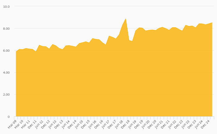Bank Equity (As % of Bank Assets) rose 1.18% yoy to 8.51% in India in 1Q2025