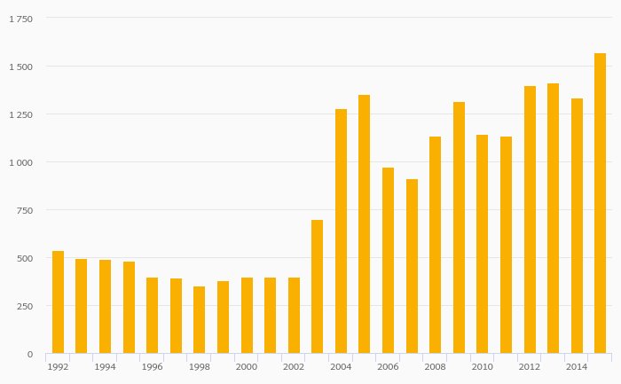Silver (Mine) Production rose 17.7% to 1,571 kt in Russia in 2015