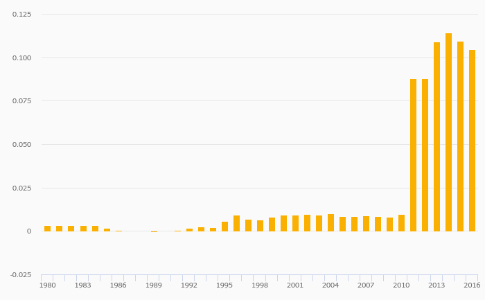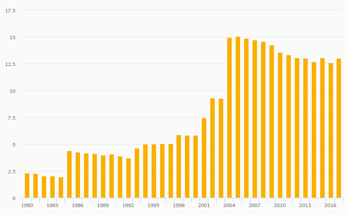 Natural Gas Reserves (As % of Worldwide Reserves) rose 3.18% to 13.0% in Qatar in 2017