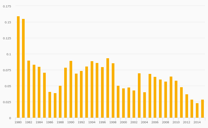 Oil Supply (As % of Worldwide Supply) fell 4.29% to 0.105% in Ghana in 2016