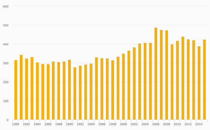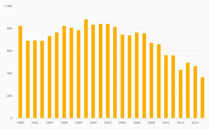 Gross Natural Gas Production fell 21.0% to 367 bil cb ft in Germany in 2015